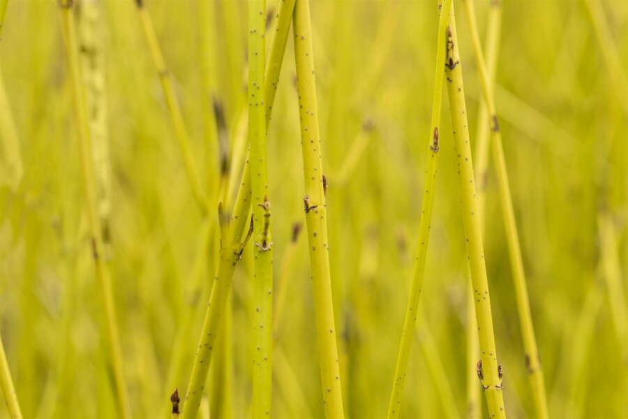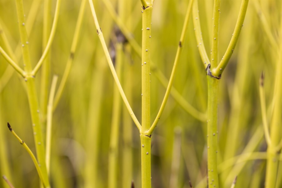 Cornus sericea 'Flaviramea', kendt som gul kornel, er bemærkelsesværdig for sine iøjnefaldende gule grene, der lyser op i vintermånederne. Denne busk blomstrer med hvide blomster i foråret og tiltrækker både bier og sommerfugle, hvilket gør den til et værdifuldt element i haven. Den trives i alle jordtyper, især i fugtige områder, og kræver minimal vedligeholdelse.