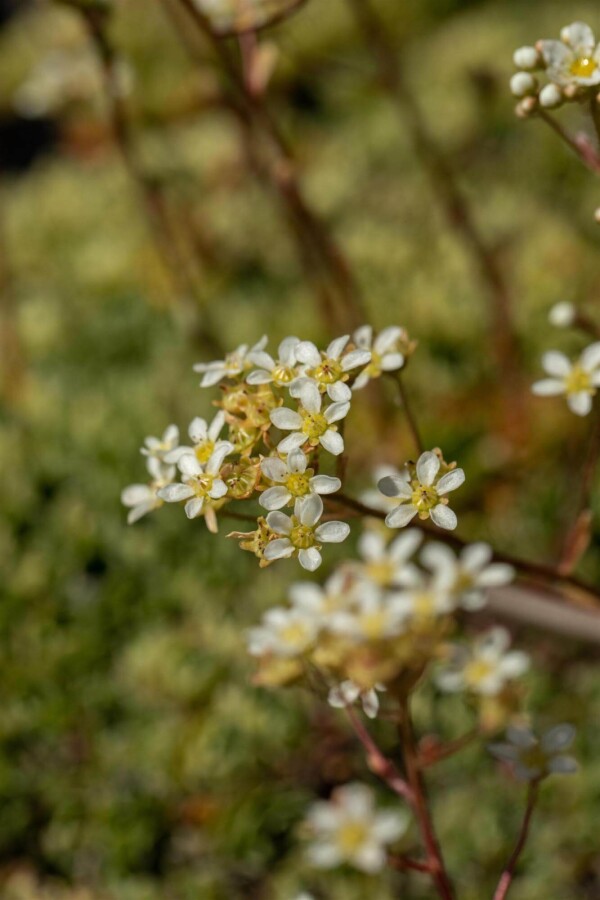 La Saxifraga paniculata, connue sous le nom de saxifrage paniculée, est une plante vivace qui se distingue par sa capacité à résister à des températures extrêmement basses, jusqu'à -40°C. Cette plante, au feuillage vert et gris, est idéale pour les bordures et les plantations de groupe, et elle fleurit en mai et juin avec de délicates fleurs blanches.
