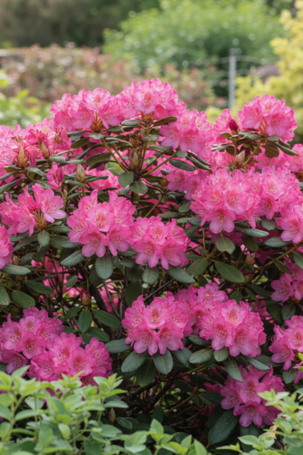 Het water geven van een Rhododendron 'Wine and Roses' struik