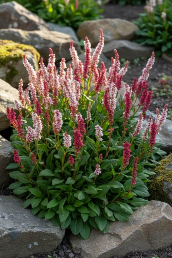 Alpormrot, även känd som Persicaria affinis 'Kabouter', är en långblommande växt som trivs i både sol och halvskugga. Denna växt är särskilt uppskattad för sin bodembedekkende växtsätt, vilket gör den idealisk för att täcka marken i trädgården. Persicaria affinis 'Kabouter' blommar från juni till oktober med vackra rosa och vita blommor.