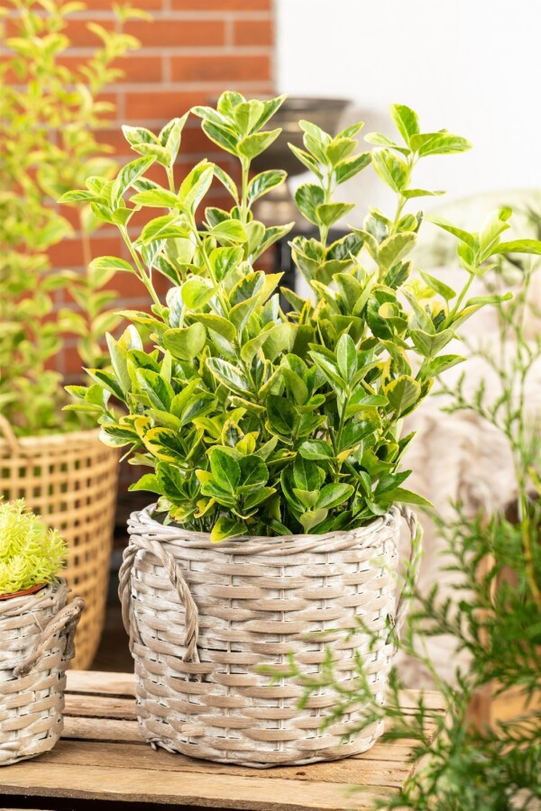 Euonymus japonicus 'Aureomarginatus' är känd för sina vackra, brokiga blad med gula kanter som ger färg året runt. Denna japanska benved är vintergrön och tål beskärning väl, vilket gör den idealisk för formklippning och häckar. Dessutom kräver den lite underhåll och trivs i både sol och halvskugga.