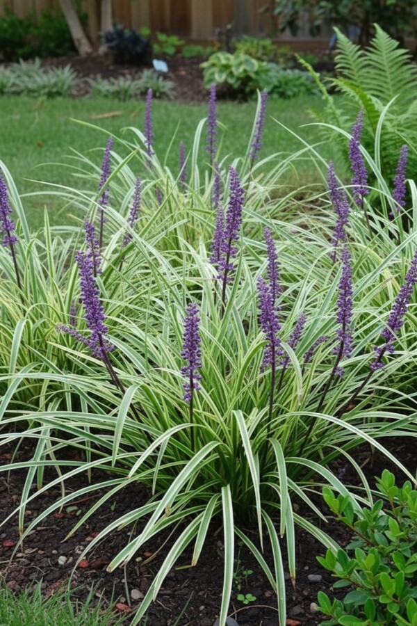 Liriope muscari 'Silvery Sunproof' har en attraktiv klumpbildande växtsätt och är en utmärkt marktäckare som erbjuder en härlig blandning av gröna och vita blad året runt. Dess lila blommor skänker ett härligt färginslag i sensommarens och höstens trädgård.